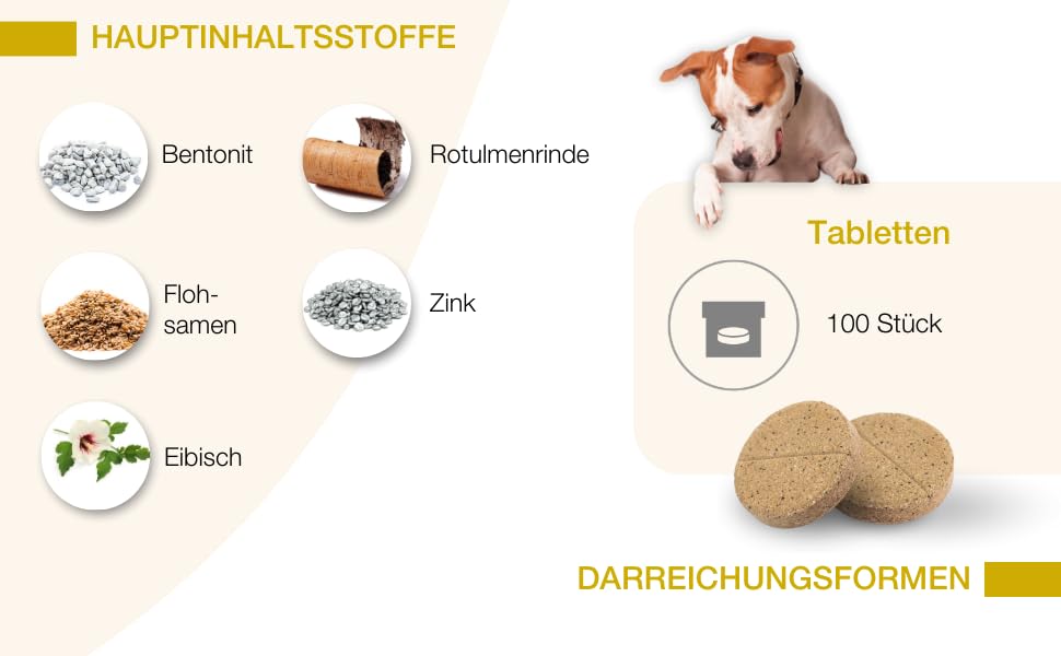 Composition: poultry protein (partially hydrolyzed), psyllium seeds (Plantago ovata) 6%, calcium carbonate, products from the processing of plants: marshmallow leaves (Althaea officinalis) 3.6%, red ulm bark (Ulmus rubra) 3.6%, licorice root (glycyrrhiza glabra), chamomile flowers (Matrix. ricaria ricaria chamilla) 1.2%, mint (Mentha spicata), Schisandra berries (Schisandra chinensis), rose hips (pink L. ), dandelion leaves