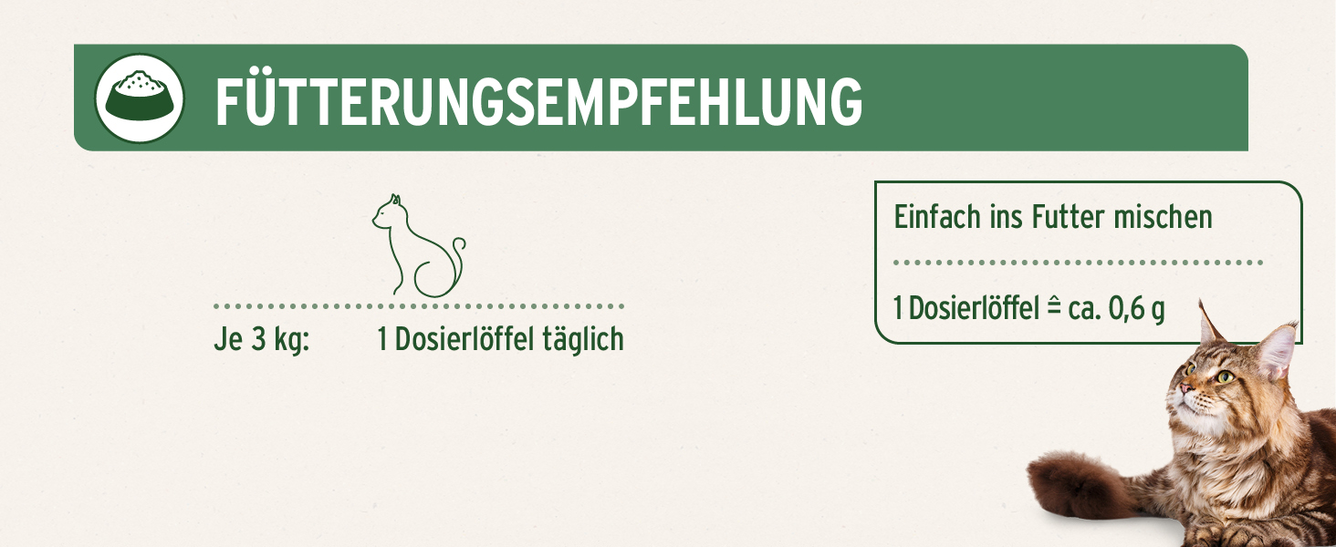 Simply mix with daily food. Cats 3 kg each: 1 dosing spoon daily (corresponds to approx. 0.6 g)