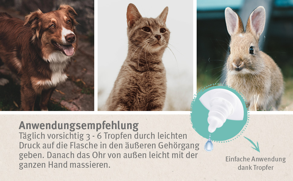 The ear drops can be used daily: 3-6 drops until the ear is well moistened. Carefully guide the ear drops to the ear and place them into the outer ear canal by applying light pressure to the bottle. Then lightly massage the ear from the outside with the whole hand. After use, the animal will shake.