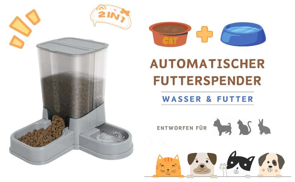 - 2 IN 1 DISPENSER This dispenser has a capacity of 0.8L for water and 1.2L for food, and will meet your pet's needs for several days.
