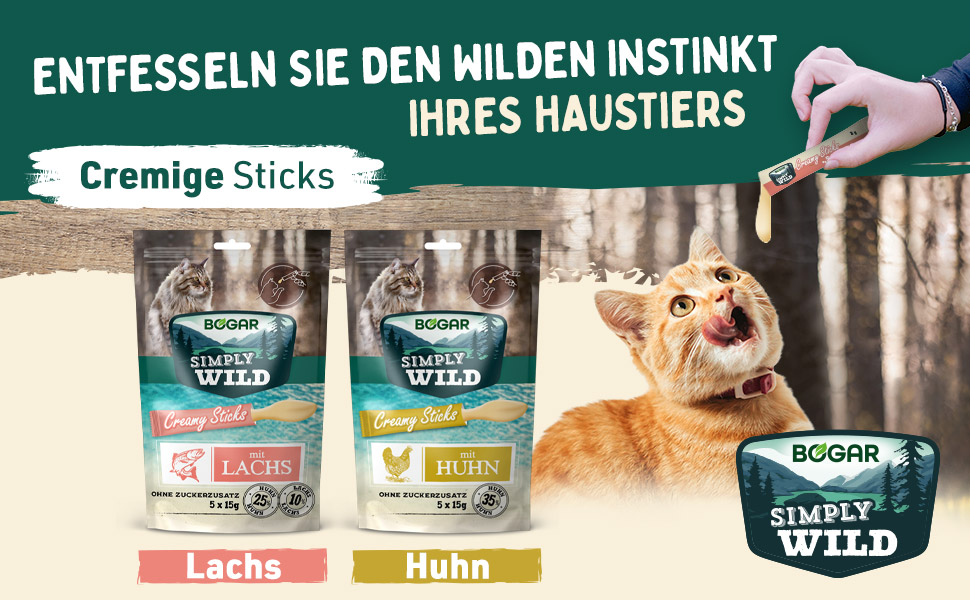 - Cat treats with salmon: Simply Wild by Bogar offers creamy cat snacks with delicious salmon. These tasty cat sticks are ideal for cats of all sizes and promote a healthy diet as an addition to cat food.
