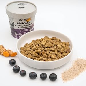 Insect flour (37%), tapioca starch (36%), carrot powder (11.7%), psyllium husks (2%), coconut flour (2%), pumpkin seed flour (2%), blueberry, dried (1.5%), coconut oil (1.5%), rapeseed oil (1%), celery powder (1%), tomato powder (1 %), turtura (0.6%), milk thistle seeds (0.3%), dandelion herb (0.3%), mannan oligosaccharides (MOS) (0.3%), fructo-oligosaccharides (FOS) (0.3%).