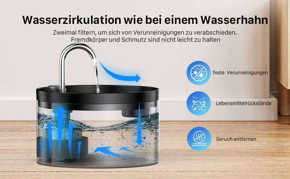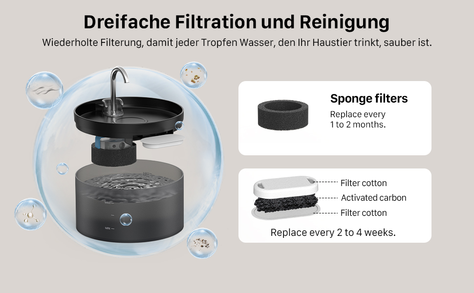 - Triple filter system: drinking fountains use a triple filter system, including activated carbon, high-density cotton layer and sponge filter. It is best to change the activated carbon filter every 2-4 weeks. This will give your pet fresher and more oxygenated water.