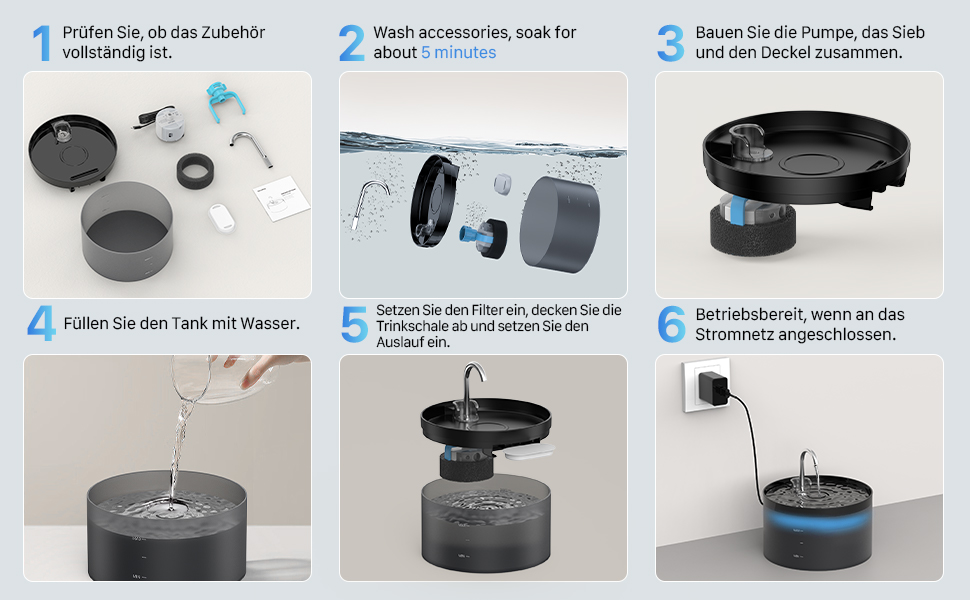 When you use it for the first time, you need to immerse the filter in water for 3-5 minutes. Make sure that the water level of the cat fountain is higher than the water level of the pump. For the health of your pet, it is best to replace the activated carbon filter every 2-4 weeks and the sponge filter every 1-2 months. If you want to clean or replace the accessories, please turn on the power first