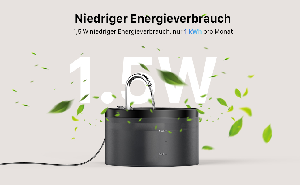 - Ultra-quiet energy-saving water pump: the water pump of the cat drinking fountain can work ultra-quietly (35 dB), so you and your pet can enjoy a peaceful sleep. At the same time, it is a 1.5 W pump with low power consumption. It consumes only 1 degree of electricity per month, which is very energy efficient and environmentally friendly. For your pet's health, it is better to clean the pump every 2-4 weeks.