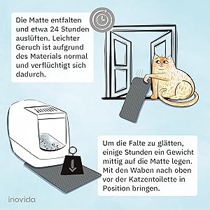 - Die Matte vor der Katzentoilette in Position bringen, die Waben sollten dabei nach oben zeigen.