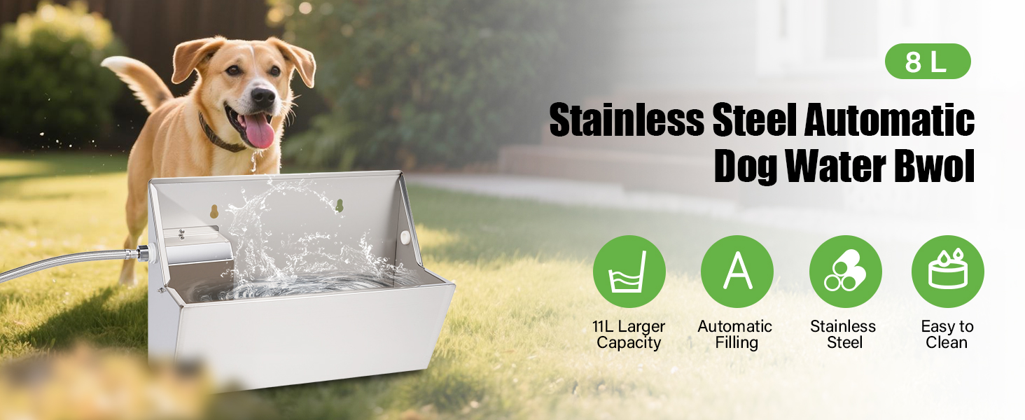 - Product size: 25 litre large capacity, automatic dog drinking fountain with float valve. Our large dog drinking bowls have a capacity of up to 8 litres, perfect for households with multiple pets! . Ideal for use on farms, ranches, chicken coops, gardens