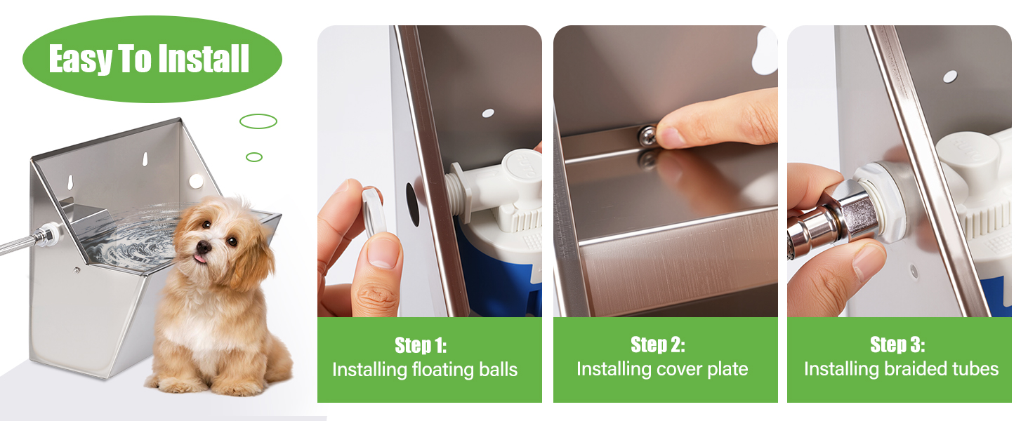 - EASY TO INSTALL & CLEAN This self filling dog drinking bowl is very easy to install: just connect the hose to the dispenser and garden tap. This drinking bowl is easy to clean, when it needs to be cleaned, just open the drain valve to clean the bottom of the drinking bowl easily and thoroughly and ensure that your pet always has fresh and clean drinking water.