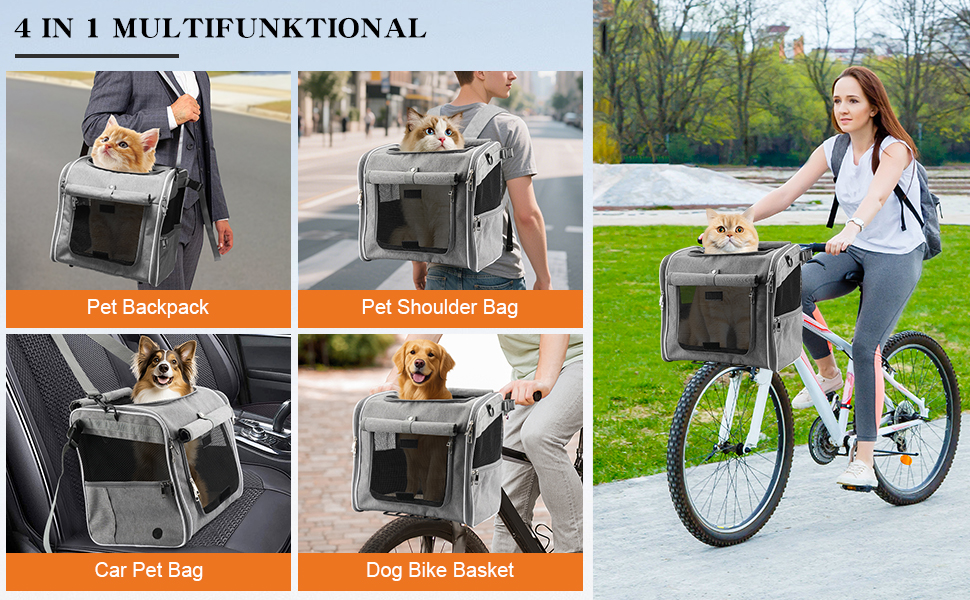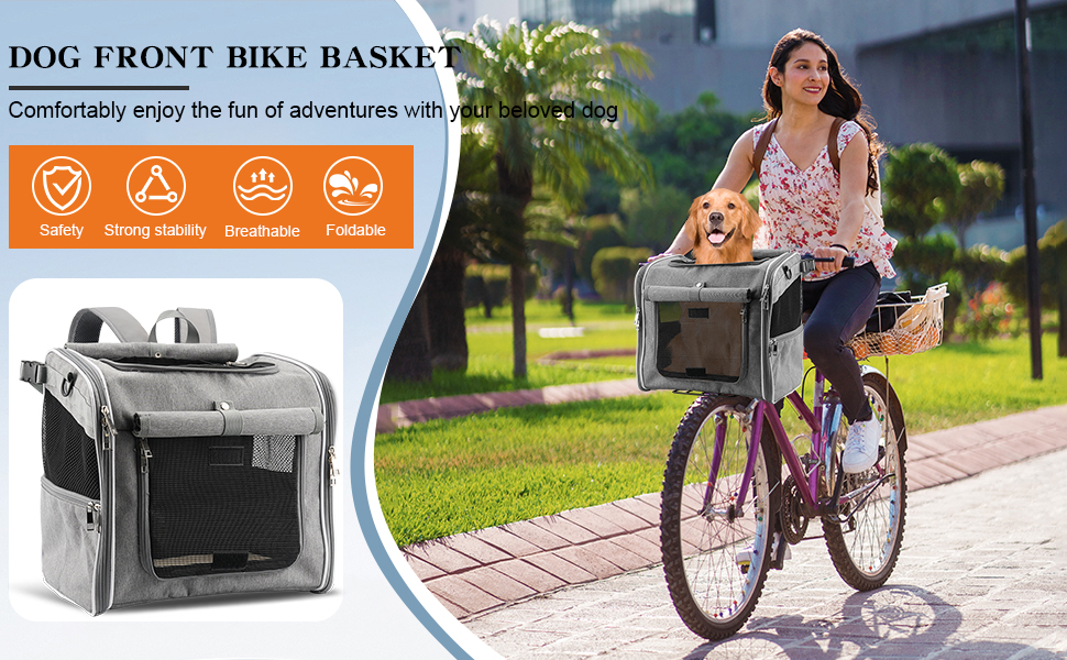 - 4-in-1 FLEXIBILITY FOR TOGETHER ADVENTURES Your faithful companion, always by your side! This versatile dog bicycle basket transforms in seconds: use it as a sturdy dog bicycle basket at the front, as a comfortable backpack for walks, as a practical shoulder bag for city strolls or as a safe car seat for travel. Thanks to the clever quick assembly system, you can easily switch between functions and are perfectly equipped for any adventure.