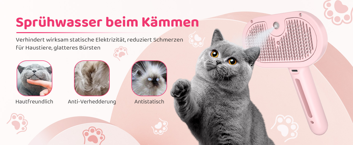 - Anti-static cat brush with steam. To avoid static electricity and flying hair, we have designed this cat brush with water tank. The fine mist effectively reduces tangles and static problems in pets. The spray brush makes brushing cats and dogs more comfortable and is an indispensable accessory for any animal lover.