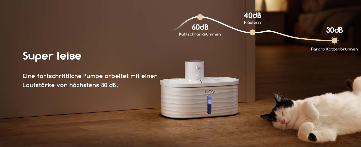 - Ultra-quiet and safe design: the pump of this drinking fountain for cat wireless works quietly ( 25 dB) and ensures a peaceful sleep for you and your pet when it is directly next to you. At the same time, the pump automatically shuts off to prevent overheating when the water level drops below the minimum, extending the life of the pump