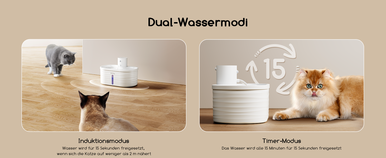 - Excellent motion sensor: This cat drinking fountain has three water modes from which you can choose: (1) induction mode: water is released for 15 seconds when the fountain detects your cat within a distance of 2 metres and an angle of 120. (2) Timer mode: water is released every 15 minutes for 15 seconds. (3) Continuous operation: water is released all the time (this mode only works when connected)