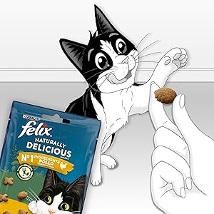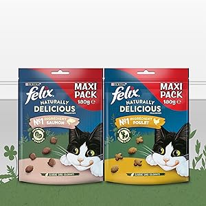FELIX Naturally Delicious Snacks | Adult | Cat Snacks | Chicken with a hint of grass | 180g (bag) Ingredients: Meat and animal by-products (38%, of which chicken * 14%), cereals, extracts of vegetable proteins, oils and fats, minerals, sugars, yeasts, vegetable by-products (dried catnip 0.1% *chicken first Instruuse of use: pay you always provide your cat with clean and fresh water. To maintain your cat's health, make sure to follow the recommended daily rations and adjust the main meal accordingly. Supervise your cat when you give it a treat. Instructions for use: recommended daily ration for an adult cat of approx. 4 kg up to approx. 14 g or approx. 34 pieces.