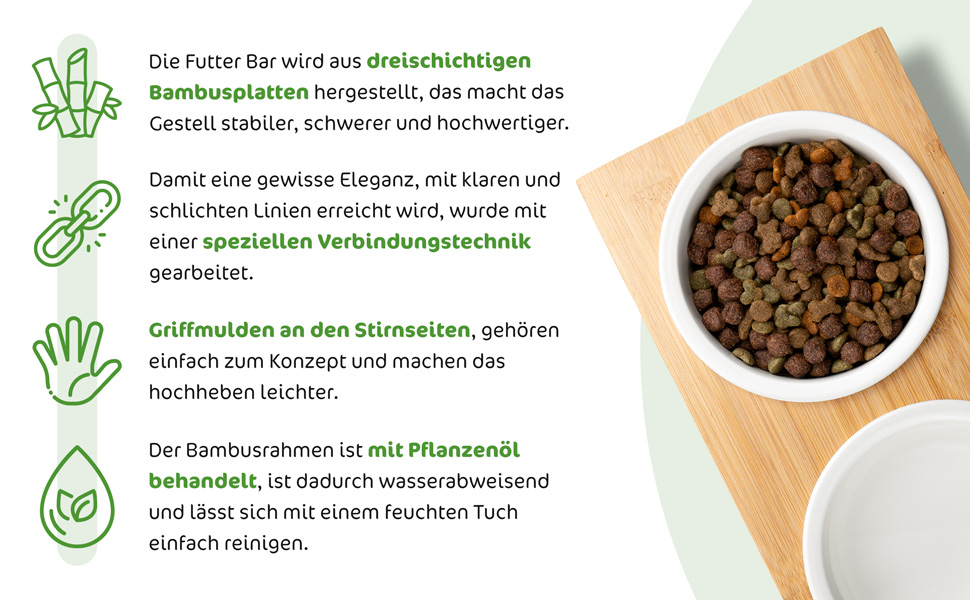 - Easy to use: the food bar is achieved thanks to its sturdy construction, which is made of multi-layered high-quality bamboo and associated inserted silicone feet that provide additional grip.