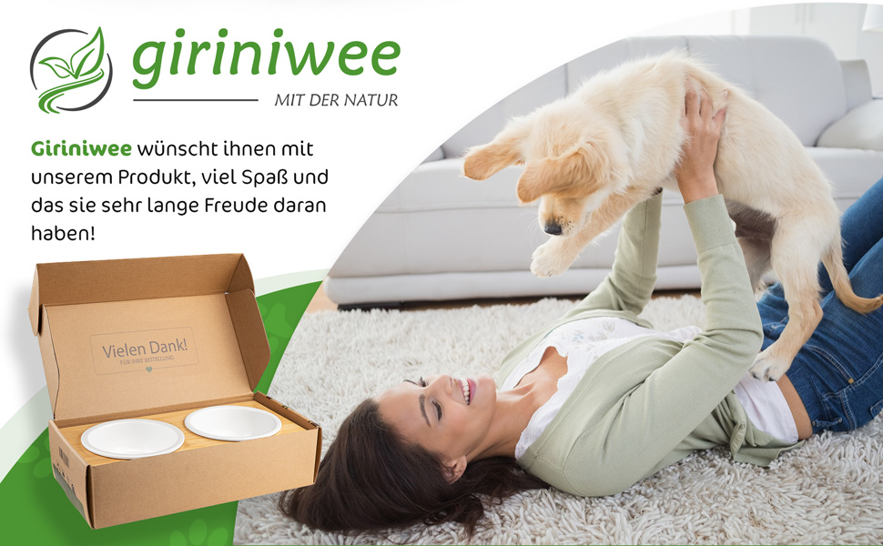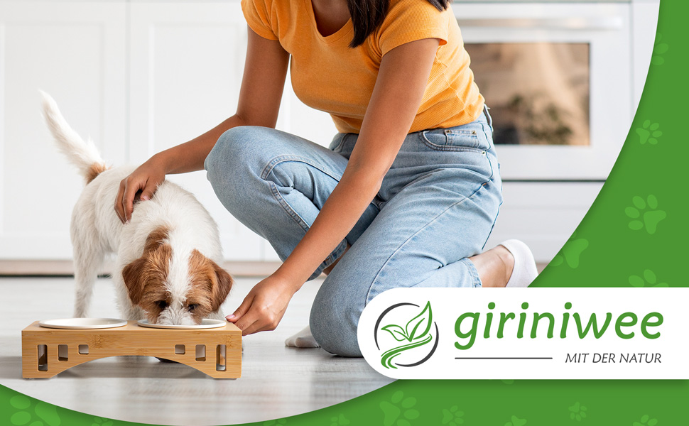 giriniwee Quality Food Bar with Two 400 ml Porcelain Bowls in Bamboo Frame, Raised Double Bowl for Cats, Kittens, Small Dogs, Puppies and Other Small Pets
