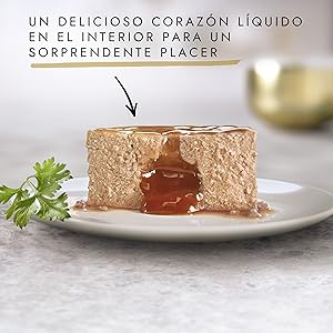 GOURMET hat GOURMET Gold Fondant kreiert, eine Reihe von weichen und unwiderstehlichen Mousses mit Ochse, Huhn, Lachs und anderen exquisiten Aromen mit einem erstaunlichen flüssigen Herz im Inneren, um Ihre Katzenfutter noch spezieller zu machen. Ihre Katze wird zuerst die weiche und zarte Mousse beißen, um dann ein unerwartetes Herz von Sukkulentensauce zu entdecken, das sie lieben wird.