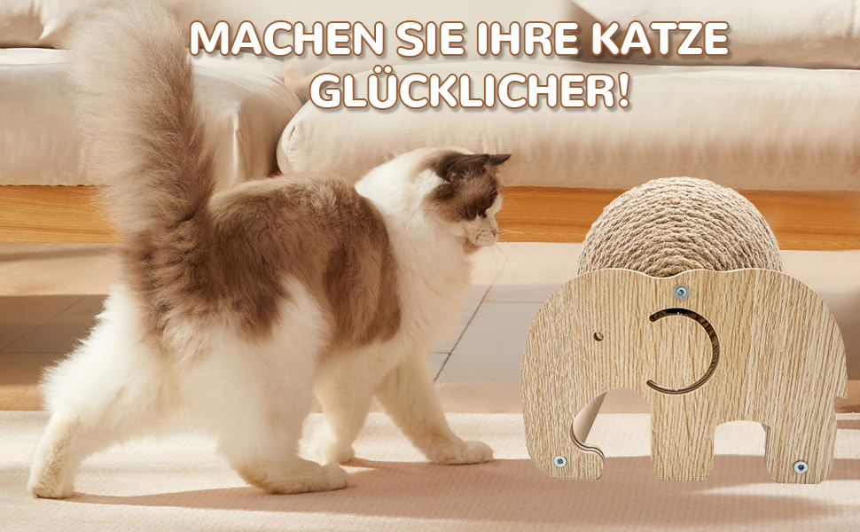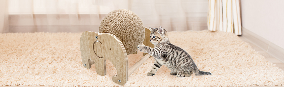 - Easy to install: This cat toy comes with installation tools, which makes installation very easy. Simply attach an elephant-shaped side board to the three poles with screws, thread the cat scratching ball through the top bar and screw the pole to the other board