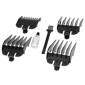 A bottle of lubricating oil, a cleaning brush and a blade guard cover complete the offer. The set also includes 4 interchangeable comb attachments (3mm, 6mm, 9mm, 12mm) for varying applications.