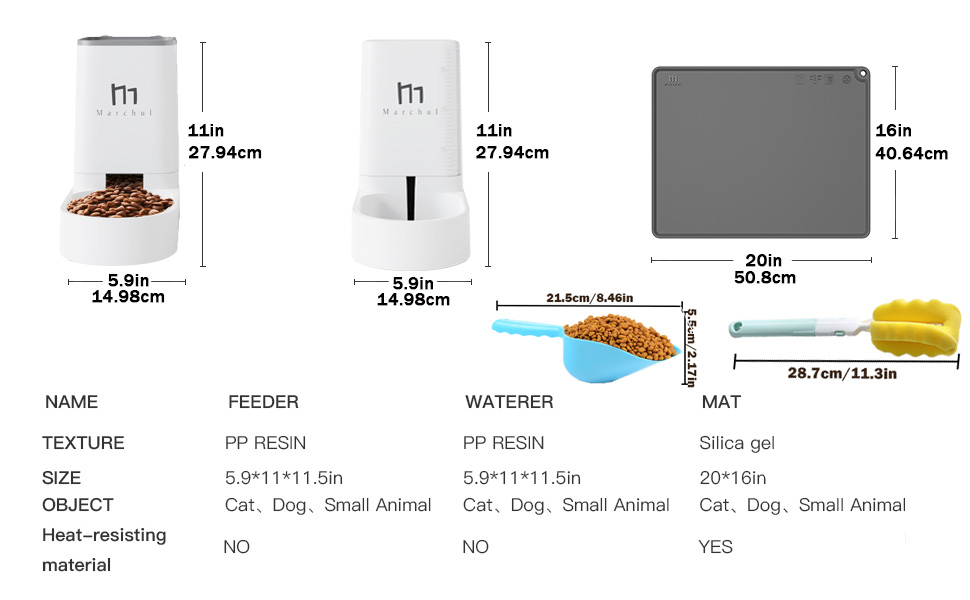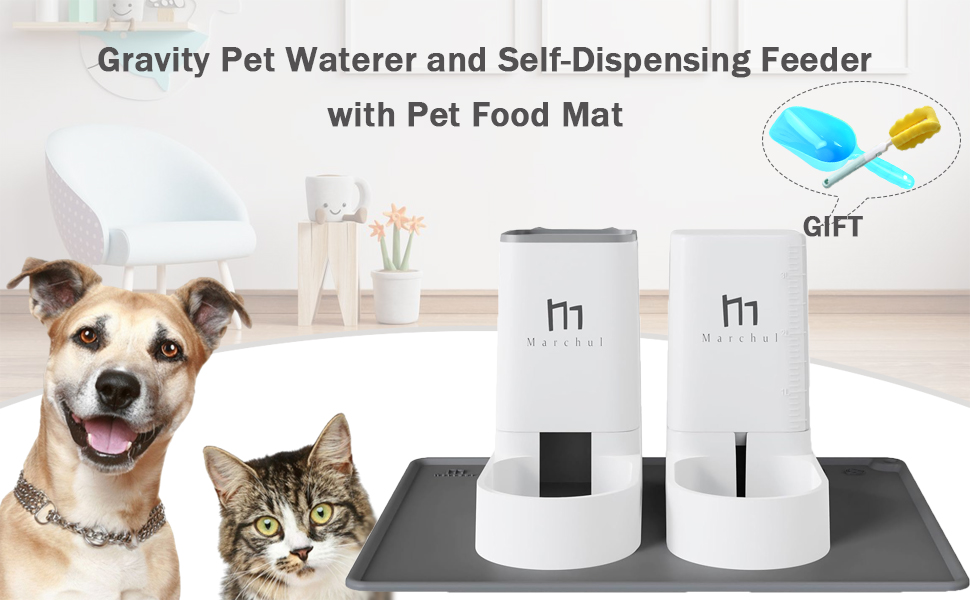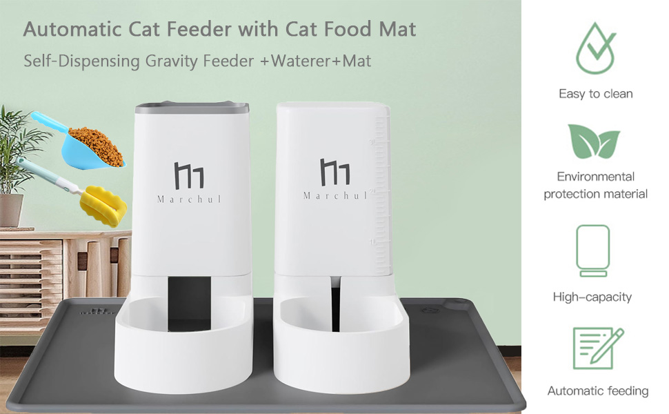 - Automatic cat feeder and waterer set: box includes: 1 x 1 gallon (3.8 L) capacity cat and dog water dispenser, 1 x 4.63 lb (2.1 kg) capacity cat food dispenser; 1 x pet food scooper; 1 x sponge bottle brush. Also have 50cm*40cm pet food mat. Cat feeding and drinking both, short trips are no longer a hassle!