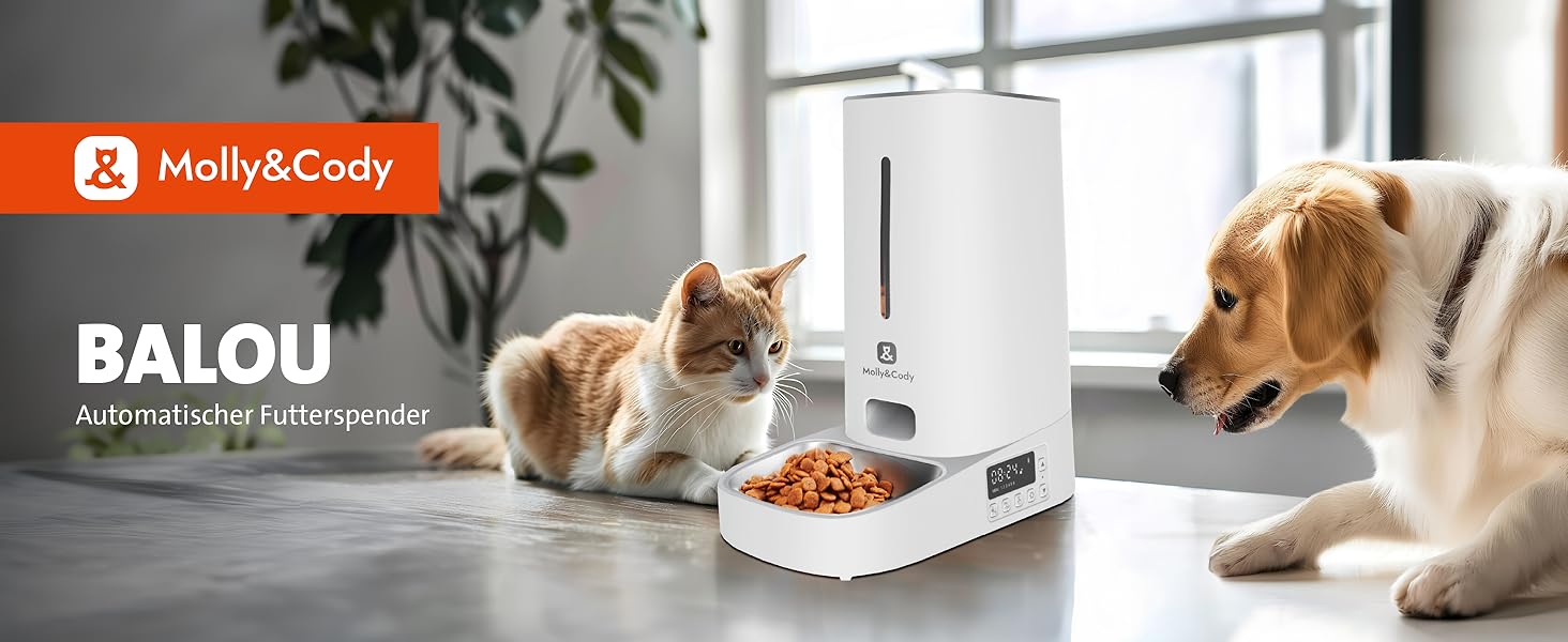 Molly&Cody Balou Automatic Feeder for Cats and Dogs (4L Container, Automatic Feeder for Dry Food, Feeding according to Schedule, LED Display, Button Lock, Dual Power Supply, Stainless Steel)