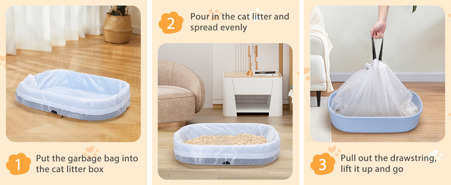 - CONVENIENT DRAWSTRING DESIGN Our cat litter trays feature an innovative drawstring design, which makes cleaning the litter box very convenient. Simply pull the drawstring lightly and the opening of the bag closes tightly, isolating odours and ensuring quick cleaning.