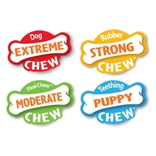 When choosing chew toys, be sure to focus on the age, weight and buying behaviour of your dog. Non-edible chew toys should be large enough to encourage chewing from the side rather than from the top and bottom. If you have more than one dog, choose chew toys for the largest dog with the most aggressive chewing behavior.