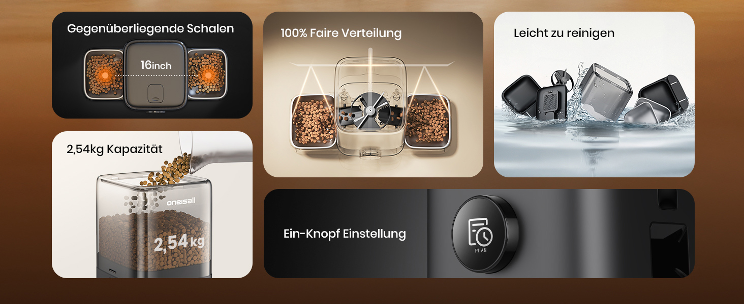 - Feed 2 pets at the same time: oneisall 5L automatic cat feeder 2 bowls is equipped with a rotating meal divider that ensures an even distribution of the food and can adjust the portion size to the needs of different cats and dogs. Each cat gets its own bowl, so they can enjoy their meal at the same time without having to argue about their food.