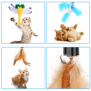 - 3 DIFFERENT "BAITS":There are 3 different replacement baits, birds, feathers and dragonflies. On each feather there are small bells that visually and acoustically stimulate your cat and inspire their hunting nature.