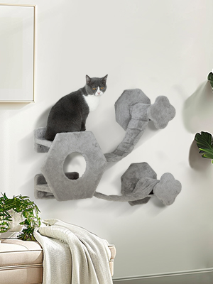 - VERSATILE PLAY FUN The cat climbing wall provides your cat with an extensive entertainment program with a cozy cat house, two ladders, two steps, a play ball and jumping platforms - for endless fun and plenty of exercise