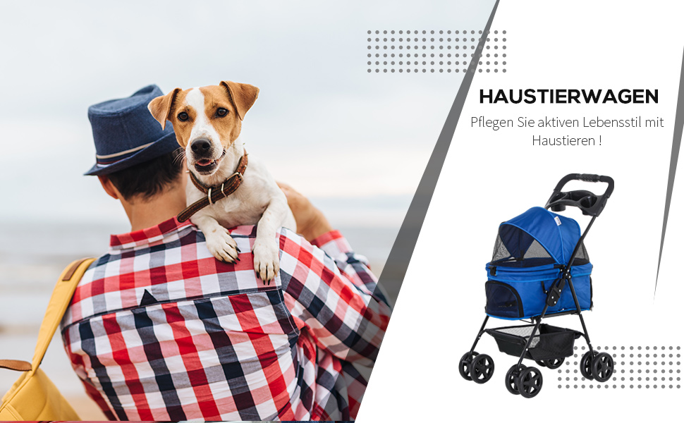 If you are looking for an easy to use, comfortable and practical dog pram for injured or older pets, look at this PawHut dog trolley. The interior is spacious, comfortable and has a mesh fabric for optimal ventilation. A bottle holder and basket provide additional storage space and thanks to the four smooth-running wheels, the trolley is particularly easy and manoeuvrable.