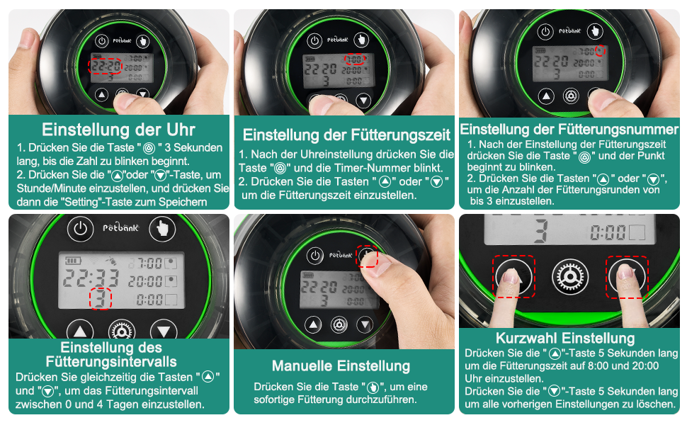 - CUSTOM FEEDING TIMES With the help of the intelligent LCD display and timer function, the Petbank fish feeder can be set to feed up to three times a day, with a maximum of 3 compartments per feeding. You can also set it to feed at any time of the day, so he can feed every other day or two, three or four days. You can also manually adjust the feeding if you want to have fun feeding