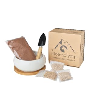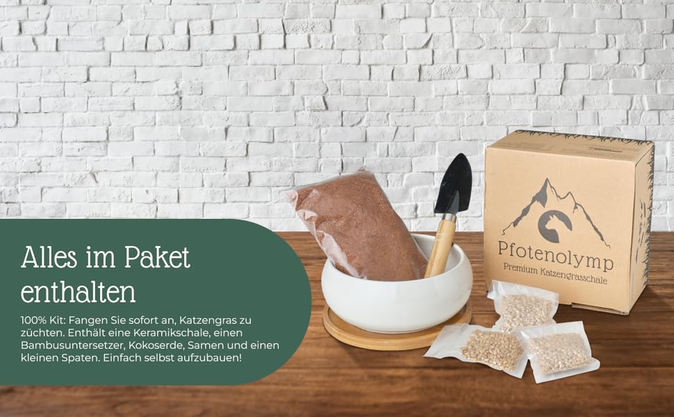 - Everything included: Start growing cat grass immediately. Set includes ceramic bowl, bamboo coaster, coconut soil, seeds and small spade. Simply do it yourself!
