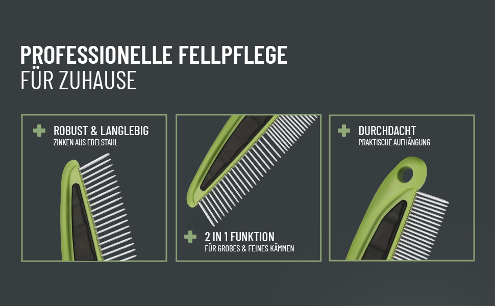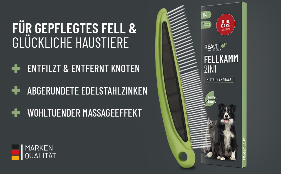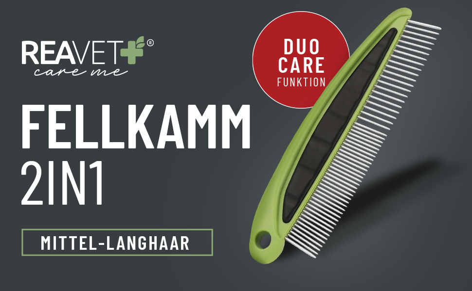 - Duo care function: grooming has never been so easy. Our ReaVET 2-in-1 fur comb with short plus long rounded stainless steel teeth ensures gentle detangling and precise care