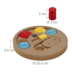 - Basics: round dog game made of MDF - dimensions (H x D): approx. 5.5 x 22.5 cm. Cut-outs H x D: approx. 1 x 3.5 cm