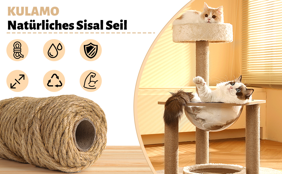 - Sisal rope for a variety of uses: the scratching post cord is the natural fibre of choice for all projects and is perfect for cats to repair or scratch. Our sisal rope for scratching post can be easily processed into expensive cat climbing trees and can be used for table legs, stool corners, wooden boards and garden chairs. Scratching post rope is also ideal for gardening and changing gifts.