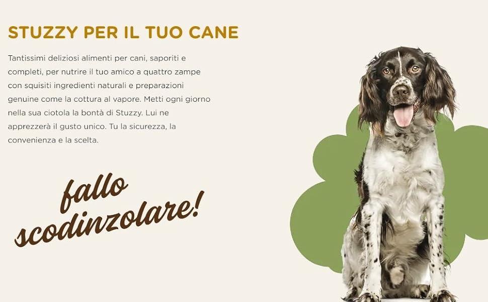 - STUZZY Monoprotein dog pate with high raw material content with selected pieces monoprotein recipe, grain and gluten free. It is an ideal complete food for adult dogs