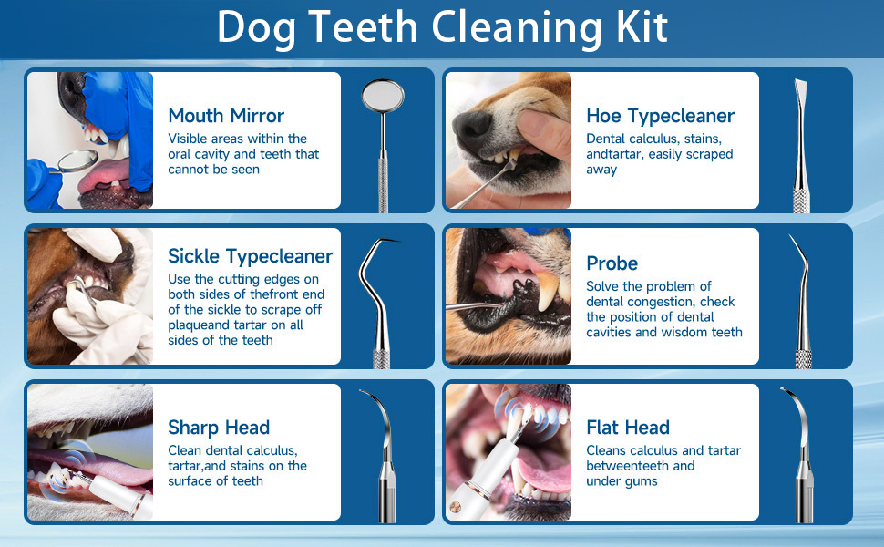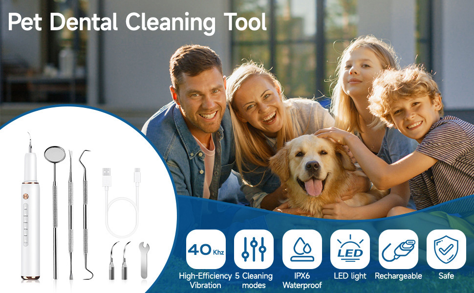 - Comprehensive professional teeth cleaning set: four interchangeable cleaning heads (pointed, flat, etc.), mouth mirror, wrench and USB-C charging cable allow veterinary cleaning at home