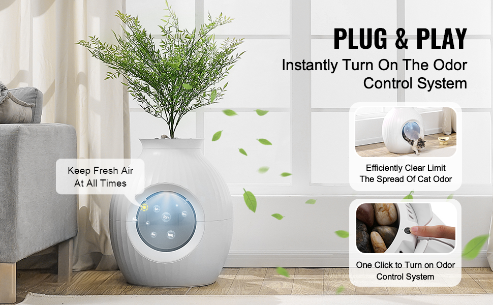 - EFFECTIVELY MINIMIZE ODORS Thanks to the plasma odor control system, this plant based cat litter box can effectively reduce the smell of cat urine and feces, minimize odor spread in the room, and bring fresh and clean air to you and your family.