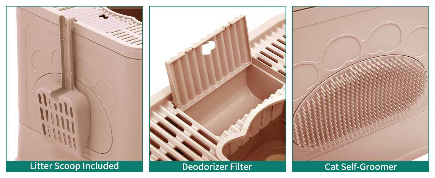 - MULTIFUNCTIONAL DESIGN With built-in cat litter scoop for hanging and a self care area to the side, which makes grooming and massaging your cat easier. At the top there is additional storage space for poop bags and deodorant packs