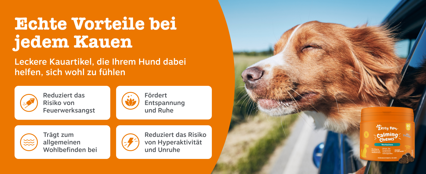 - Always stay calm and wag on - Zesty Paws Calming Chews are delicious turkey flavoured dog treats that can be given to dogs during normal stress, nervousness and hyperactivity.